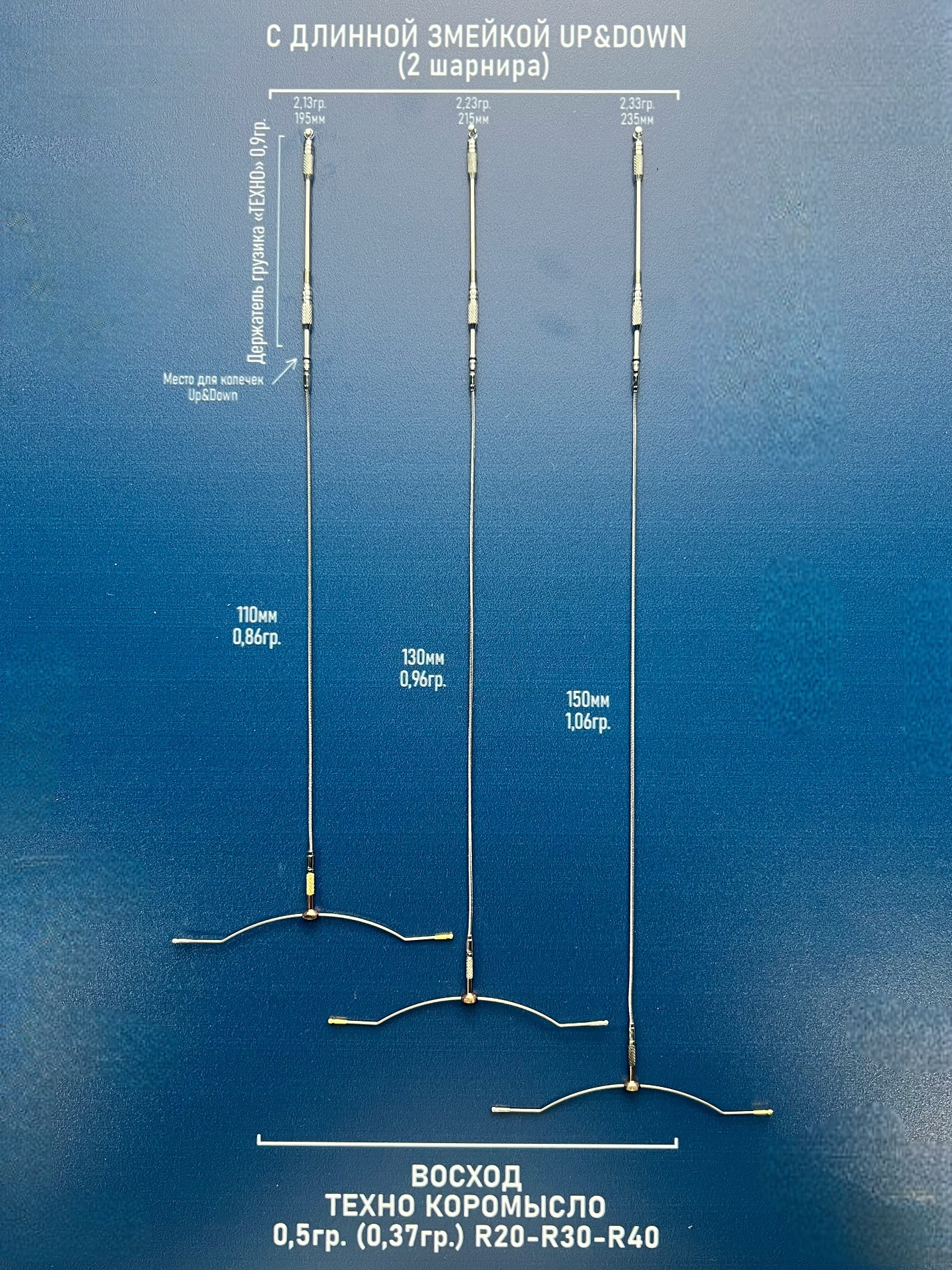 - Держатель грузика Up&Down 0,9г, длинная змейка на шарнирах 110мм 0,86г, подпасок ВОСХОД ТЕХНО-КОРОМЫСЛО R20 или R30 или R40 0.37г. Итого минимальная грузоподъемность поплавка с указанным комплектом - 2,13г, общая длина монтажа 195мм.