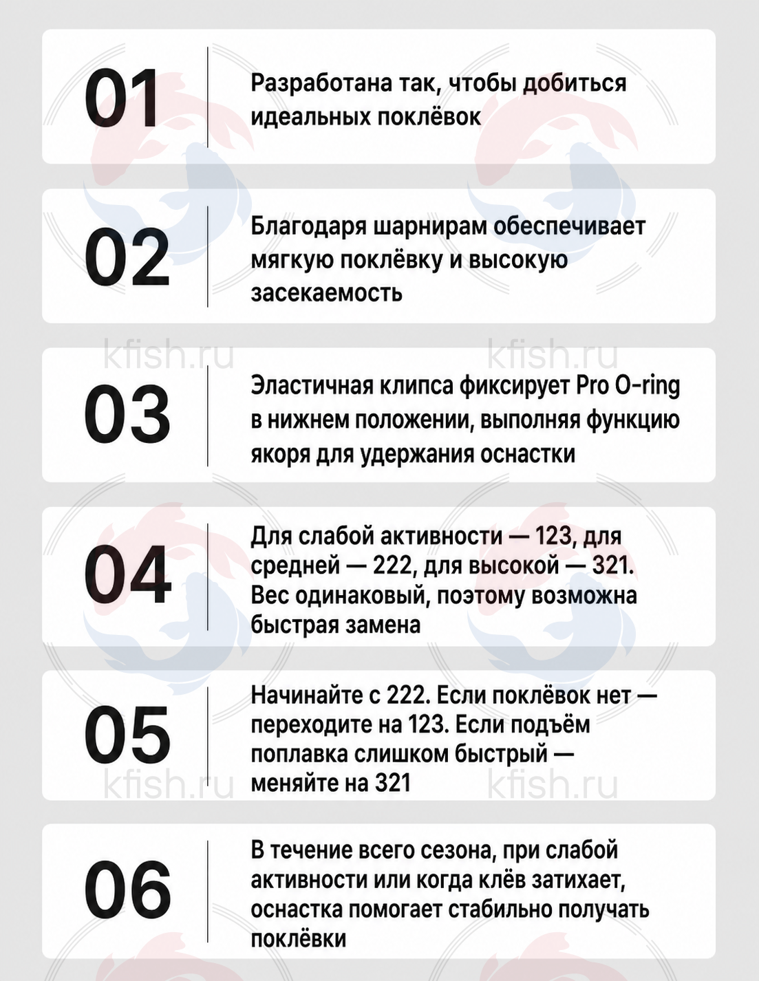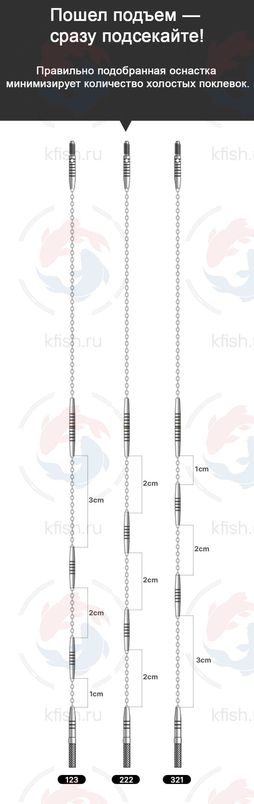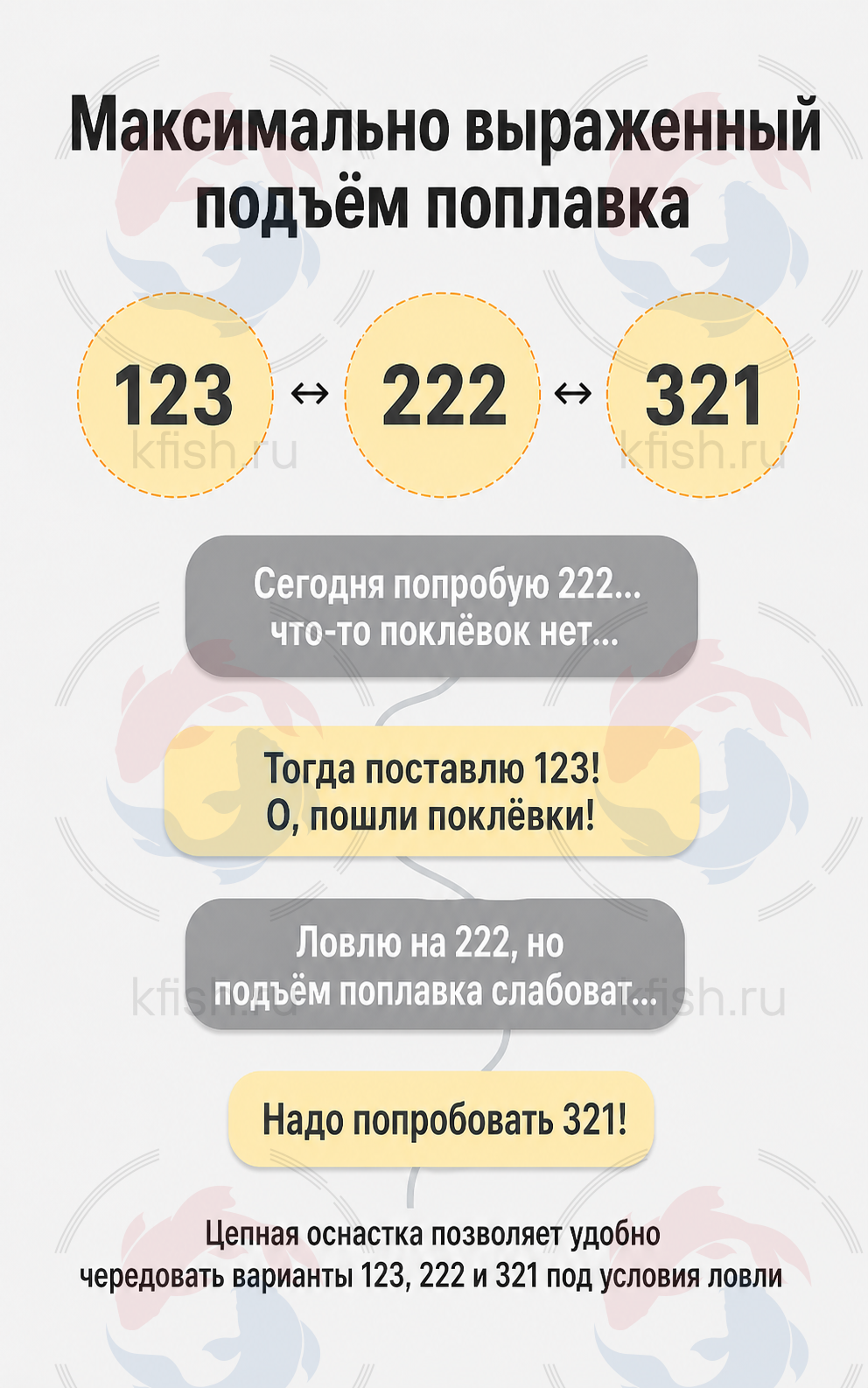 Рекомендуется начинать ловлю с 222. Если поклёвок нет — перейти на 123. Если подъём поплавка слишком быстрый — заменить на 321.